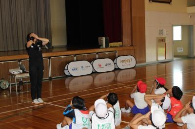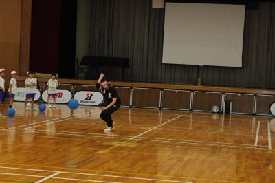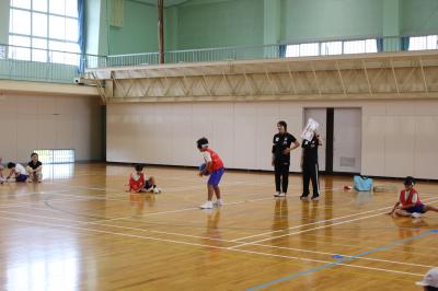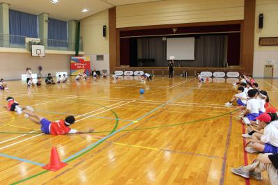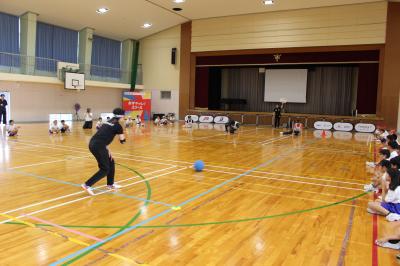 次に、ボールの止め方や投げ方を教えていただきました。1人で3mくらい守らなくてはいけないので、音のする方に反応して体を伸ばすことなども体験しました。また、投げ方もいろいろあって、ブラジルの選手の投げ方や回転して投げる方法も教えていただき、実際にやってみました。なかなかまっすぐ投げることができず、苦労している様子が見られました。
