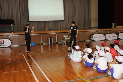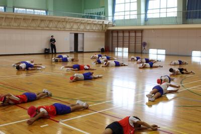 そして、代表の子がゴールボールの試合体験をしました。ルールを確認した後、赤チームと白チームに分かれて試合をしました。投げるときに方向がわからずに違う方向に投げてしまったり、ボールとの距離がわからず止めることができなかったりしましたが、みんなとっても楽しそうにプレーしていました。最後にエキシビジョンマッチとして、先生3人チーム対高田さんの試合も行いました。高田さんは1人で9m分を守り切り、先生チームの惨敗でした…。