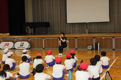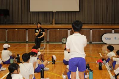 最後に、高田さんのこれまでの経験やそこから学んだことなどをお話していただきました。パラリンピックに出場したことでいろいろな人に感謝することが大切であることを学ばれたそうです。子どもたちからの質問にも答えていただきました。「試合前には緊張しますか?」や「けがをしたことがありますか?」などの質問に対して、丁寧に答えてくださいました。