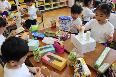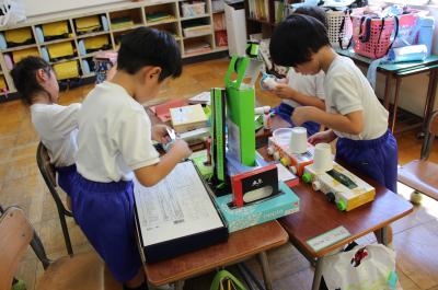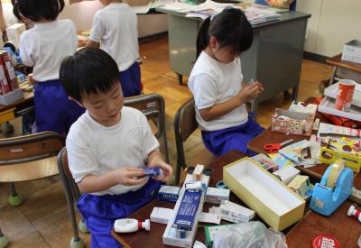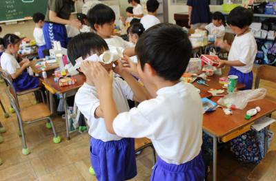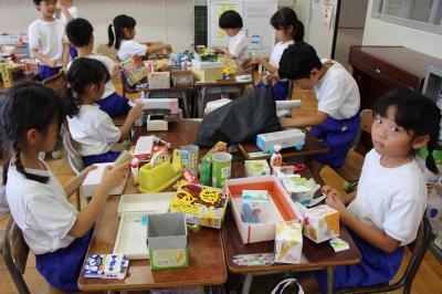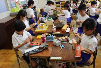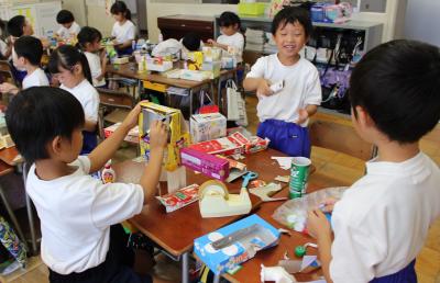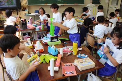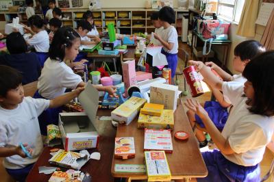 今日は、1年生が図工科の授業で、箱と箱を組み合わせてイメージした物をつくりました。