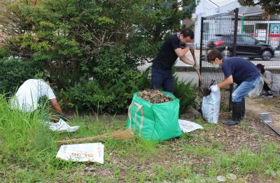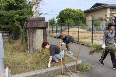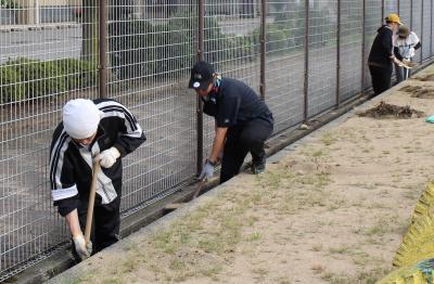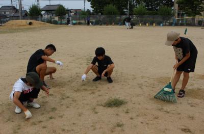 先出地区は運動場中学校側の側溝泥上げとフェンス際の草取りです。
