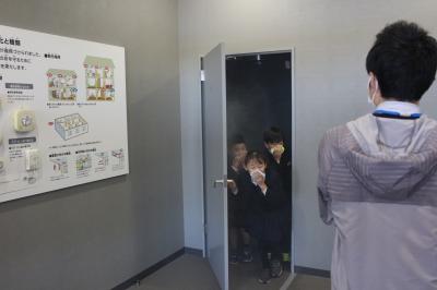 その後、煙が充満した薄暗い部屋の中で、非常口の明かりを頼りに出口まで進む体験をしました。みんな、説明をする方のお話をしっかりと聞いて、安全に出口まで進むことができていました。
