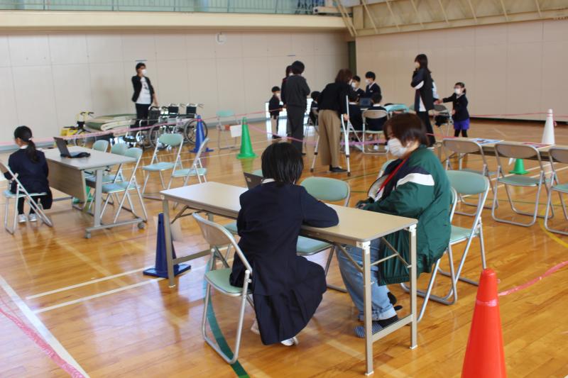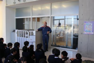 そして、地震体験もしました。震度5の揺れの中で、素早く机の下にかくれて安全を確保する体験をしました。