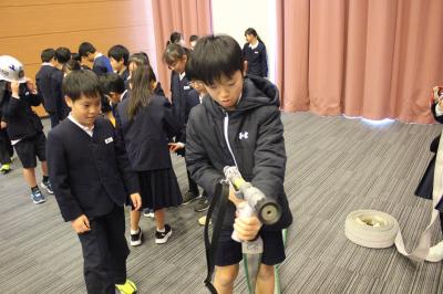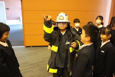 最後に、消防士の方が身に着けている防火服を身に着けたり、消防のホースを持ったりする体験もしました。想像以上の重さにびっくりした様子でした。さらに、児童が考えた質問にも答えていただけました。