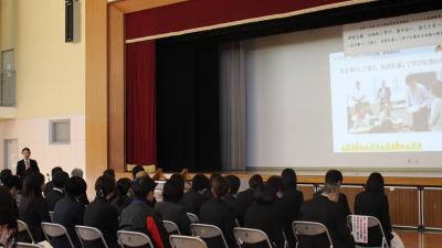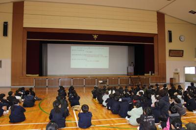 最初に、校長先生から人権についてのお話がありました。人権とはどういうものかについてや人権を守るためにしてはいけない行動などについて、お話してくださいました。