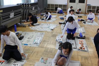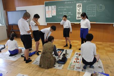 今日は、6年生が書道の先生山本先生に、書初めを指導してもらいました。