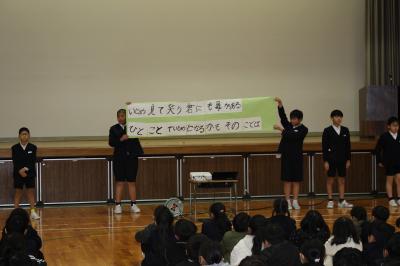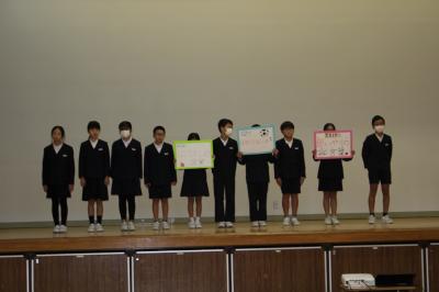 そして、環境委員会からは「人権の花」の取組についてや「ストップいじめの標語」の優秀作品の紹介をしました。なぜこの標語にしたのかの理由も話して、みんなにいじめをしないように呼びかけました。