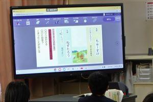 自分のクロムブックを見せながら、自分につくったお話を説明しています。