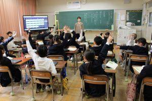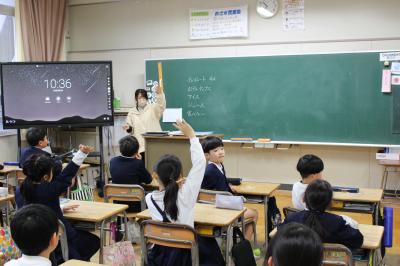 これは、電子黒板の画面に映っているように潜水艦が大きな魚に食べられないようにするゲームです。まず、クラス全員が算数の計算問題などを次々に解きます。正解すると、大きな魚にダメージが与えられ、後ろに下がっていきます。ダメージがいっぱいになるまで、潜水艦が食べられずにゴールするとクリアです。みんな真剣に集中して問題を解いていました。