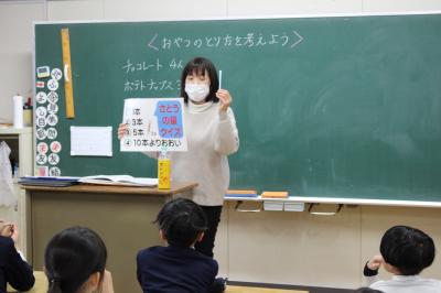 さらに、いろいろなカロリーが書かれたおやつの中から、200キロカロリー以内になるように組み合わせを考える「おやつバイキング」のワークシートをしました。ルールは「200キロカロリー以内」「2・3個組み合わせる」「飲み物を入れる」の3つでした。どの子も全部で200キロカロリー以内になるように、組み合わせを工夫して考えていました。中には、1個全部食べると200キロカロリーをオーバーしてしまうので、半分だけ食べるなどの工夫をしている子もいました。そして、考えた組み合わせをペアの人に伝える活動もしました。
