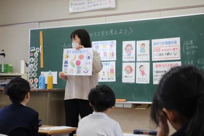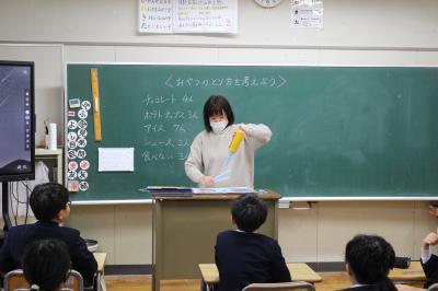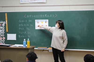 最後に、中尾先生からおやつの食べ方で気をつけてほしいことなどを教えていただき、振り返りを書きました。「これからはお菓子の裏に書いてあるカロリーを見てから食べたい」とか「おやつを食べすぎないように気をつけたい」などのふり返りを書いて、発表していました。