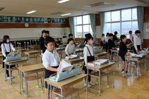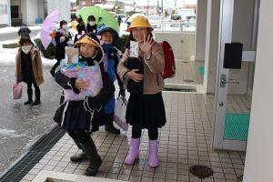 今日は4限後、給食を食べ、大きな荷物を抱え、子供たちは元気に下校しました。