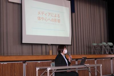 今回のテーマは「みんなで考えよう メディアとのつき合い方」でした。校長先生のお話の後、保健委員会の子が発表しました。