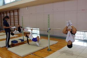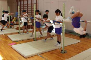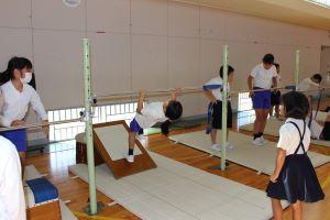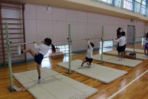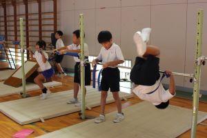 こちらは、跳び箱の踏み台を使って、逆上がりの蹴り上げの練習中・・