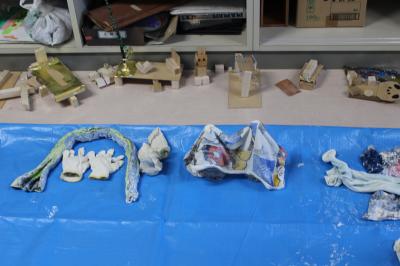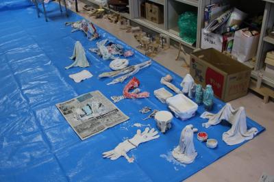 これは、自分たちが持ってきた布のものを、液体粘土につけて、固めて、形を作り作品にするというものです。