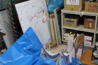 タオルや手袋などをつけて、いろいろな形に固めていました。液体粘土につけた布は、水を入れたペットボトルの上にのせたり、ブルーシートの上にのせたり、洗濯ばさみでぶら下げたりして乾かしています。