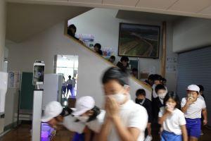 火災時は防火シャッターが下りるため、子供達は、児童玄関から出て運動場に向かいます。