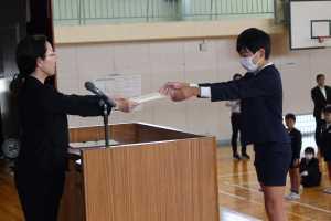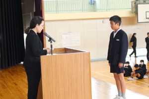 委員会役員の代表として、6年生の運営委員会委員長の村上さんに任命書を渡しました。