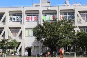 校舎3階の窓には、今年の運動会のスローガンが貼られました。