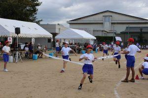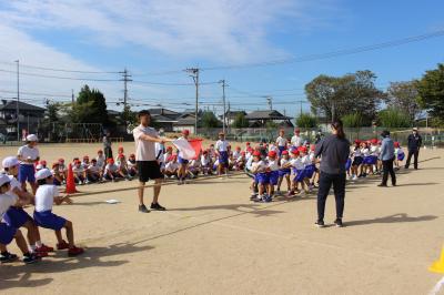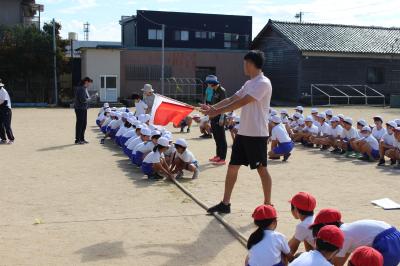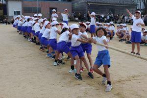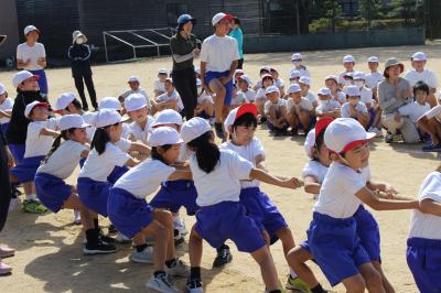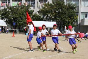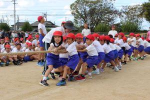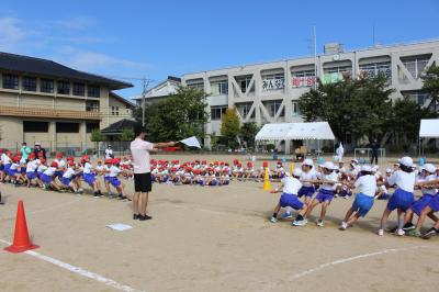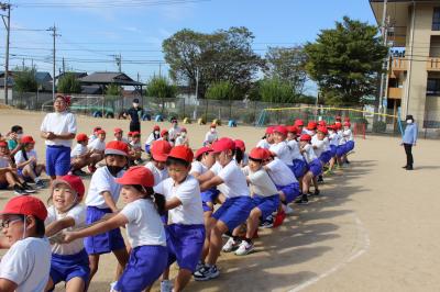 最後に、高学年が引く練習をしました。さすが高学年、どちらも全力で引き合い、なかなか勝負がつきませんでしたが、最後はわずかに赤が引いて、赤が勝ちました。本番はどちらが勝つのか楽しみです。