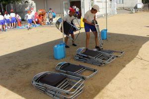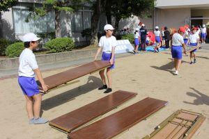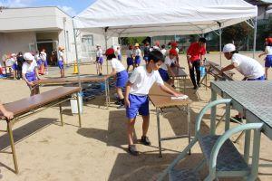 手の空いている人から、机と椅子をを組み立てて、水拭きします。