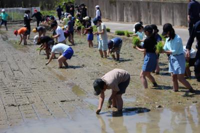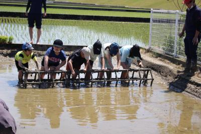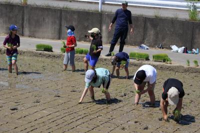 JAの方々の指導の下、順番に田んぼに入り、苗を植えていきました。