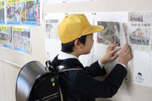 児童玄関の前の掲示板には、情報委員会の委員がおすすめの新聞の写真と記事を切り抜き、その感想が書いてあります。