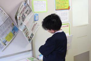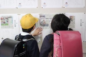 朝、登校してきた児童が、掲示板の新聞を読んでいました。