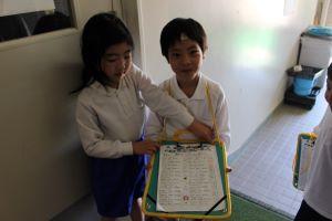 1年生は、生活科の学習で、先生方に自己紹介をして、名前を聞いて、サインをもらう活動をしています。