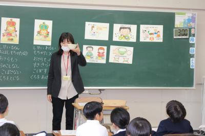その後、栄養士の先生から、食べるときのマナーとして気をつけてほしいことを実演も交えながらお話ししていただきました。そこで、児童と確認していたことは、次のことです。