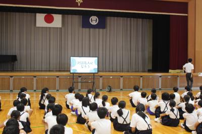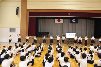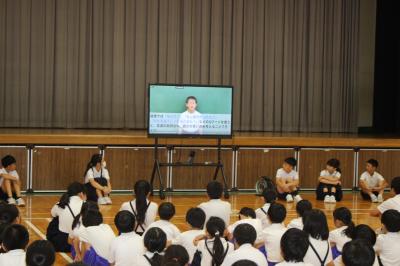 全校集会の後半、6年生がモデルとなって作成した「対話名人になろう!」の動画を全校みんなで視聴しました。
