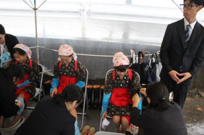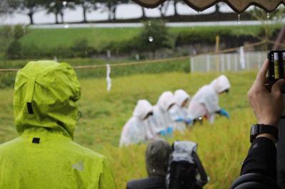 降りしきる雨の中、たくさんの方が見学に来られていました。刈乙女(かりめ)の4人も大役を終えて、ほっとした様子でした。