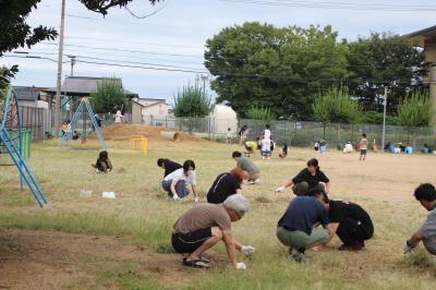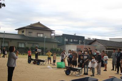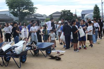 開始前に、小雨が降るあいにくの天気でしたが、たくさんの保護者と5・6年生児童が参加してくれました。