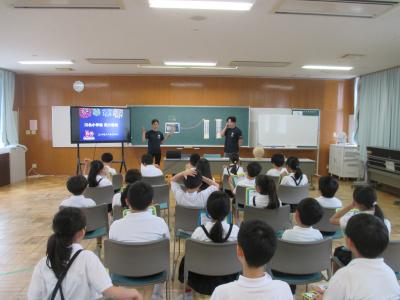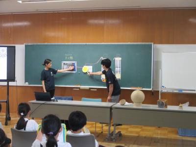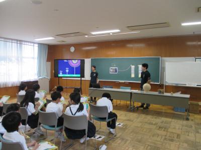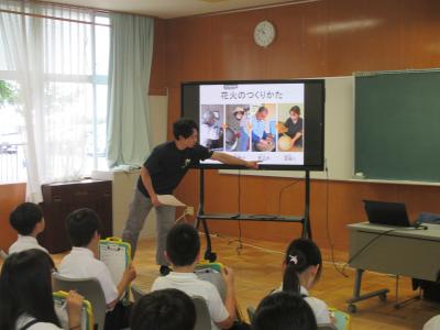 花火の種類についてや花火をどうやって作っているかやどうやって打ち上げているかなどを、写真や図を使ってわかりやすく教えてくださいました。花火が直径300mくらいになることを聞くと、子どもたちは「えーーー!」と声を出し、とても驚いた様子でした。