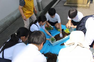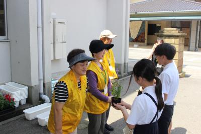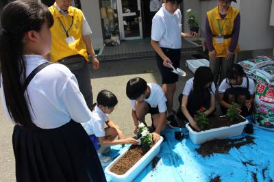 その後、いただいたお花をプランターに植えかえました。環境委員会の児童がプランターに土を入れ、穴をあけて、そこに花を植えました。