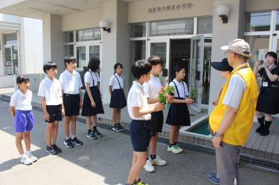 川北小学校の代表として、環境委員会の児童が花を受け取りました。その後、この人権の花にこめられたメッセージを人権擁護委員の方がお話してくださいました。