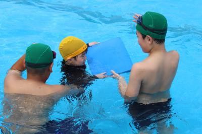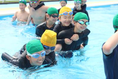 でも、6年生におんぶしてもらってすいすい!大きなプールに洗濯機のような流れができ、ぷかぷか流れるプールの完成です。ビート板を使い、6年生に引っ張ってもらいながら泳ぐこともできました!