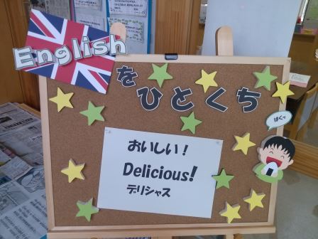 図書室前にも、英語紹介コーナーができあがりました。今回は「Delicious」です。