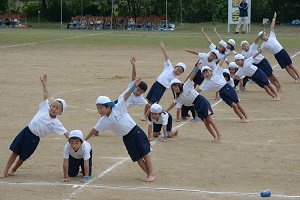 今年の運動会は心配した天気も爽やかな秋晴れになり開催することができました。写真は今年はじめて1,2年生が挑戦した組体操と中庭のアンパンマンの前で5.6年生が記念にとったものです。ご声援ありがとうございました。