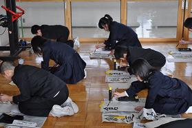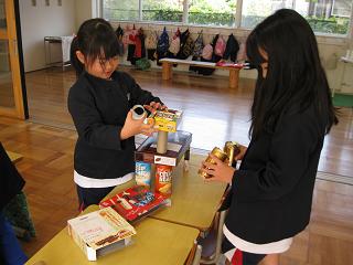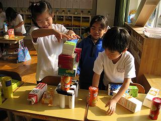 今、1年生は、算数で「かたちあそび」という勉強をしています。まず、箱を使った「積み木遊び」を通していろいろな形に慣れ親しみ、「なかまわけ」で、形に目を向けるという学習です。