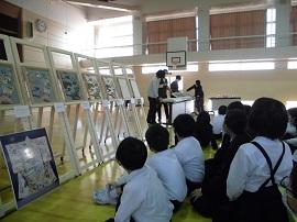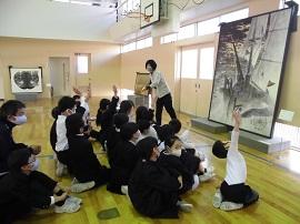 11月11日(水)県立美術館より、絵画や彫刻の作品が体育館に運ばれ、小さな美術館ができました。学年ごとに鑑賞し楽しむことができました。