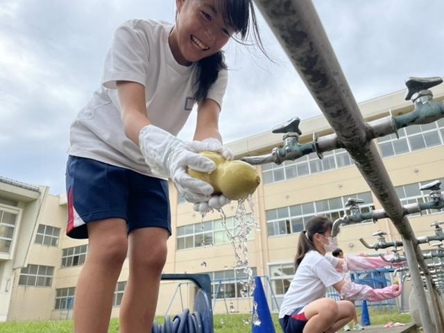 ひょうたんのうす皮をはがしました。かなりのにおいで、みんなしびれました