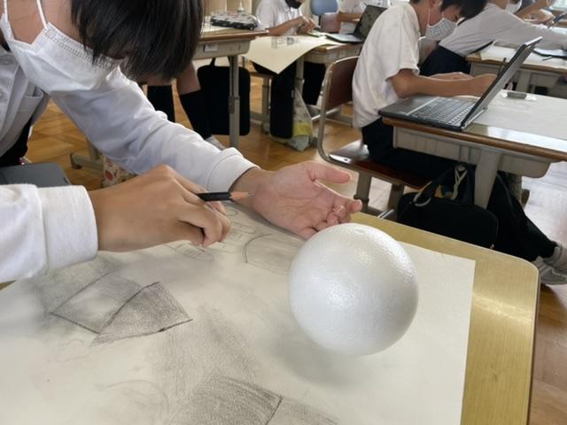 鉛筆1本でどうやって立体的に書くか、真剣に手やボールを見ながら、描いています。