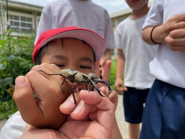 いろんな生き物を捕まえたらしく、見せに来てくれました。まだ小さいバッタにも、とても大きなミヤマクワガタにも、命があるんだよね(*´ `*)
