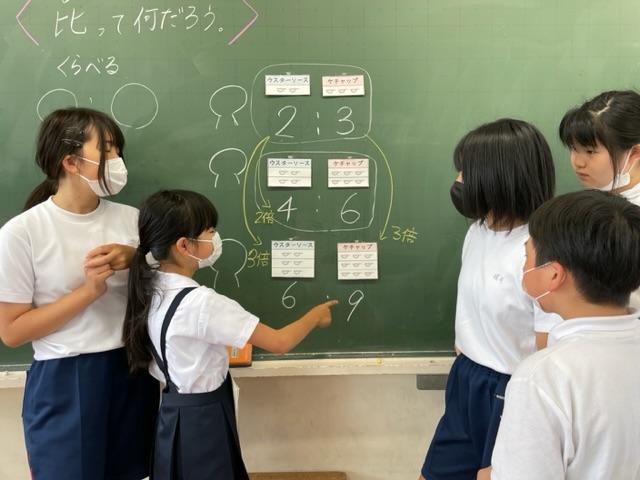 6年生の算数の授業にお邪魔しました。「ソースとケチャップを2:3で作った時と4:6で作った時で同じ味なのか?」というハテナを考えました。