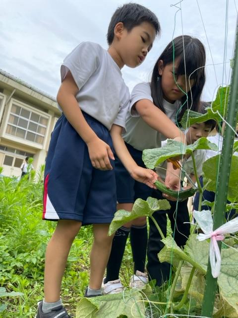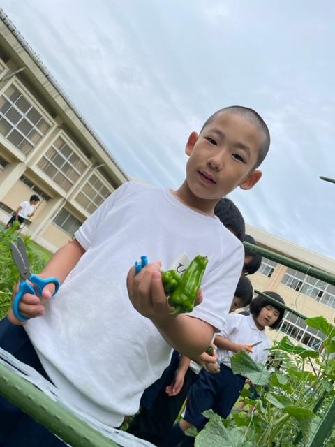 生活科で育てた野菜がたくさん採れました。キュウリにピーマン、ナスにオクラ…キュウリのトゲが痛かったです♪₍₍ (̨̡ ‾᷄へ‾᷅)̧̢ ₎₎♪