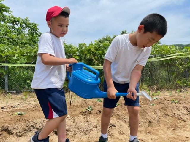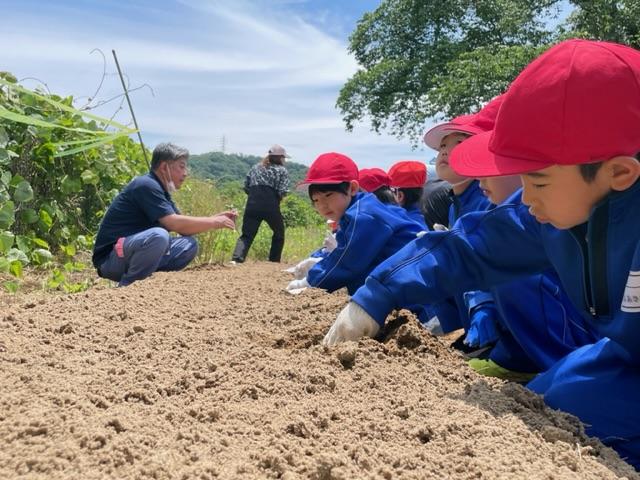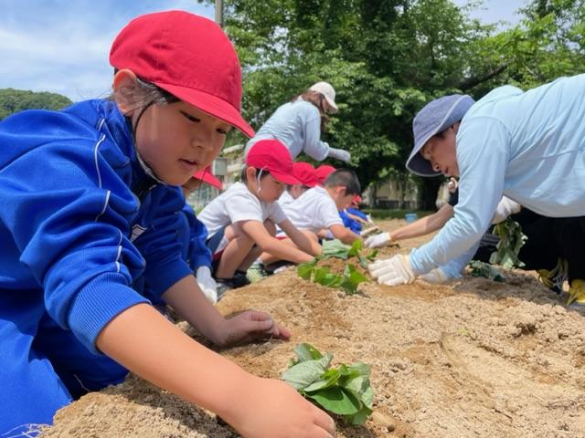 JAの先生に教えていただき、さつまいもの苗を植えました"٩(ー̀ꇴー́)「紅はるか」という品種らしく、とても美味しそうです。秋の収穫が楽しみですね(❁ᴗ͈ˬᴗ͈)
