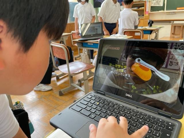 今では当たり前に机の上にある端末、教科書と一緒に使うことでさらに詳しいことが分かります。観察しながら、調べることもできます。