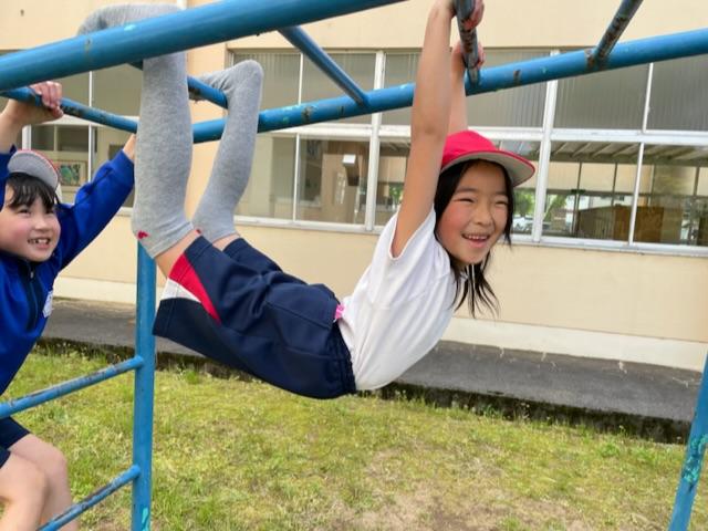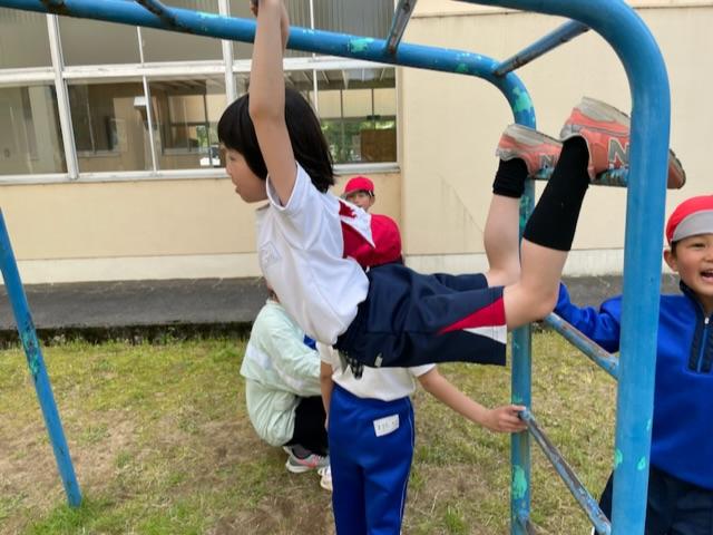 中庭にあるうんていで「先生見て~」って声がするので行ってみると、見たこともない格好をして遊んでいる子を発見(☆∀☆)