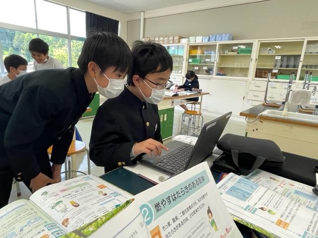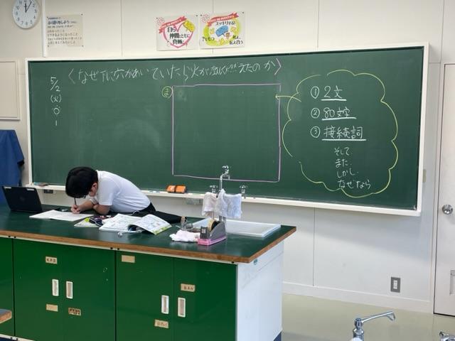 「なんで下に穴が開いた缶は物がよく燃えるのか?」を考えました。80文字以内で、2文。接続詞を1つ使うという条件でまとめて見ました。子どもたちは、考え続けていました。